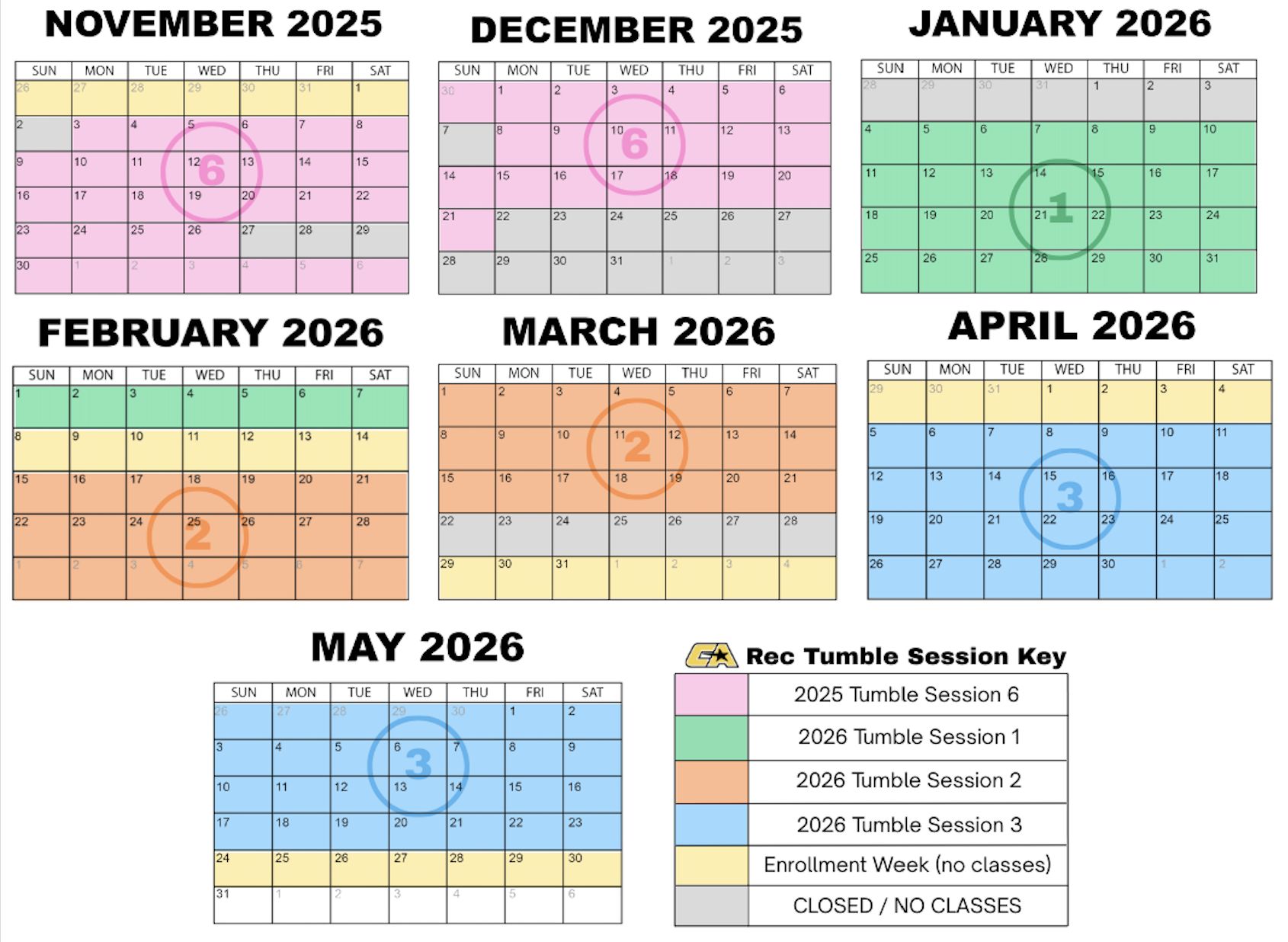 - Classes are set on a month by month bases, not the same billing and/or scheduling as the rec tumbling classes. Email us for further questions!